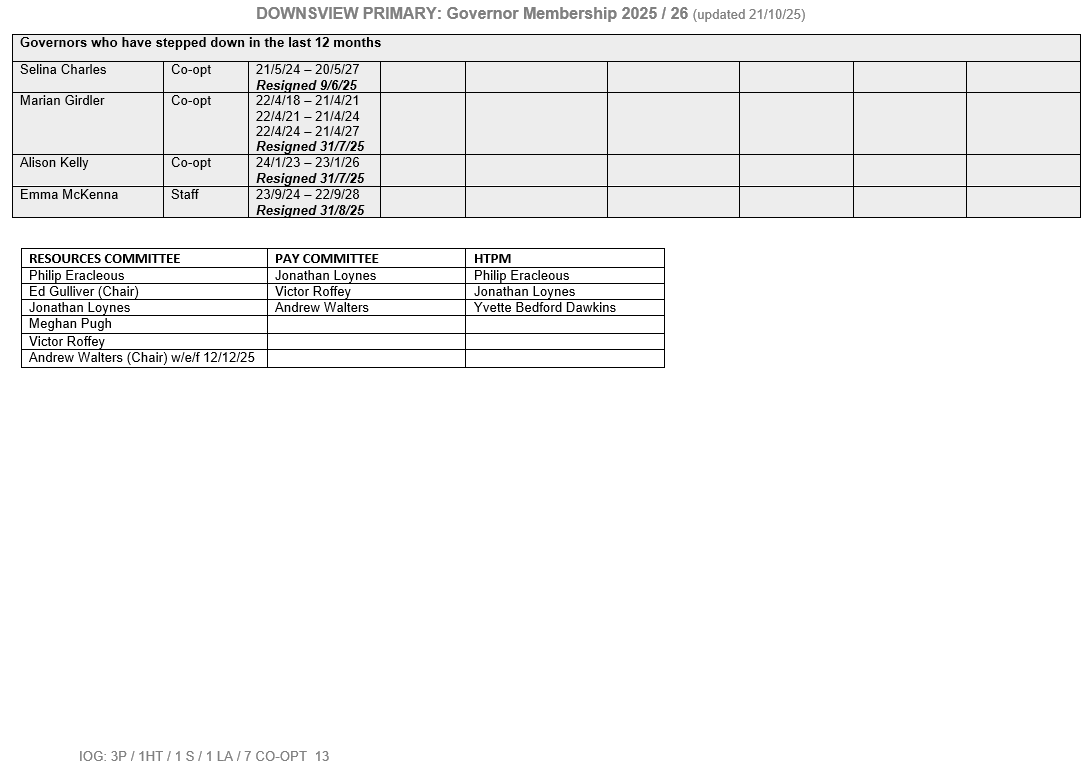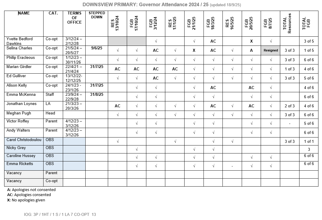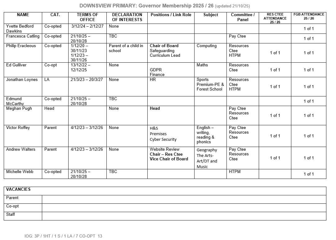 The Downsview Governing Board consists of one single committee that meets formally six times a year; Governors regularly visit the school at other times across the school year. Governors usually serve a term of three years and provide their services in an unpaid capacity.