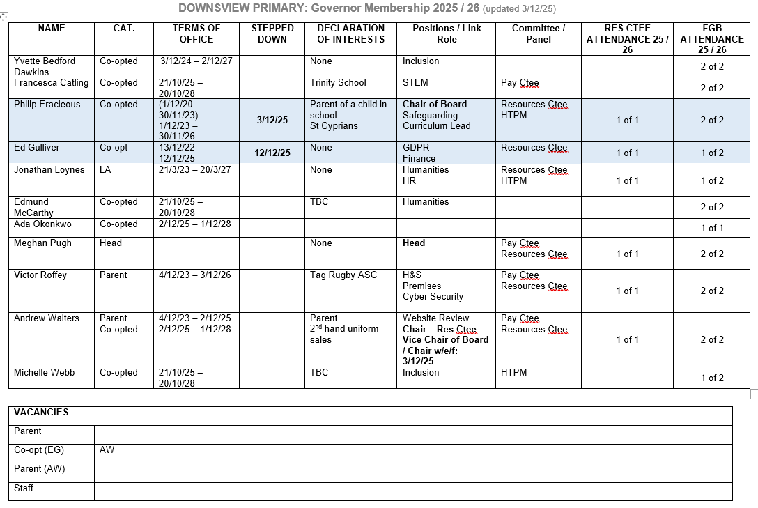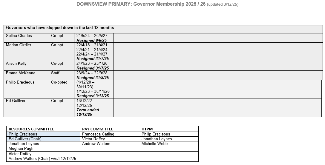 The Downsview Governing Board consists of one single committee that meets formally six times a year;  Governors regularly visit the school at other times across the school year.  Governors usually serve a term of three years and provide their services in an unpaid capacity.